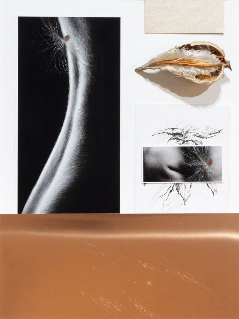 Photo collage/drawing, wood, Bronze, Copper, Dried plant, Acrylic box